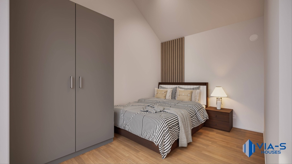 Unser neuestes 50 m2 großes Projekt bietet einen großzügigen Wohnbereich, zwei isolierte Schlafzimmer und ein beträchtliches Loft mit einer modernen und praktischen Treppe, die dorthin führt. Die großzügige Aufteilung des Hauses ermöglicht es Ihnen, eine große Anzahl von Gästen unterzubringen oder einfach einen tollen Familienurlaub zu verbringen! Innenschiebetüren sparen Platz und schaffen Platz für eine Vielzahl von Einrichtungsgegenständen.